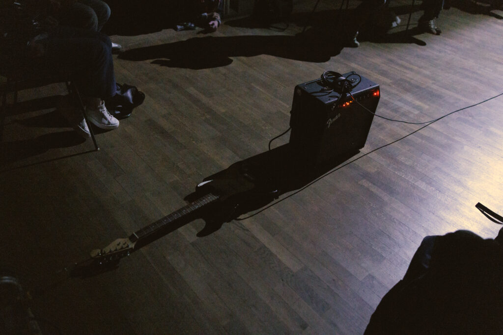 Stück für drei Gitarren ist eine kinetische Installation. Drei E-Gitarren werden per Seilwinde durch die Stadt gezogen, Verstärker folgen. Bewegung und Untergrund bringen die Saiten zum Klingen und erzeugen eine fortlaufend variierende Klanglandschaft für die Besucher*innen.